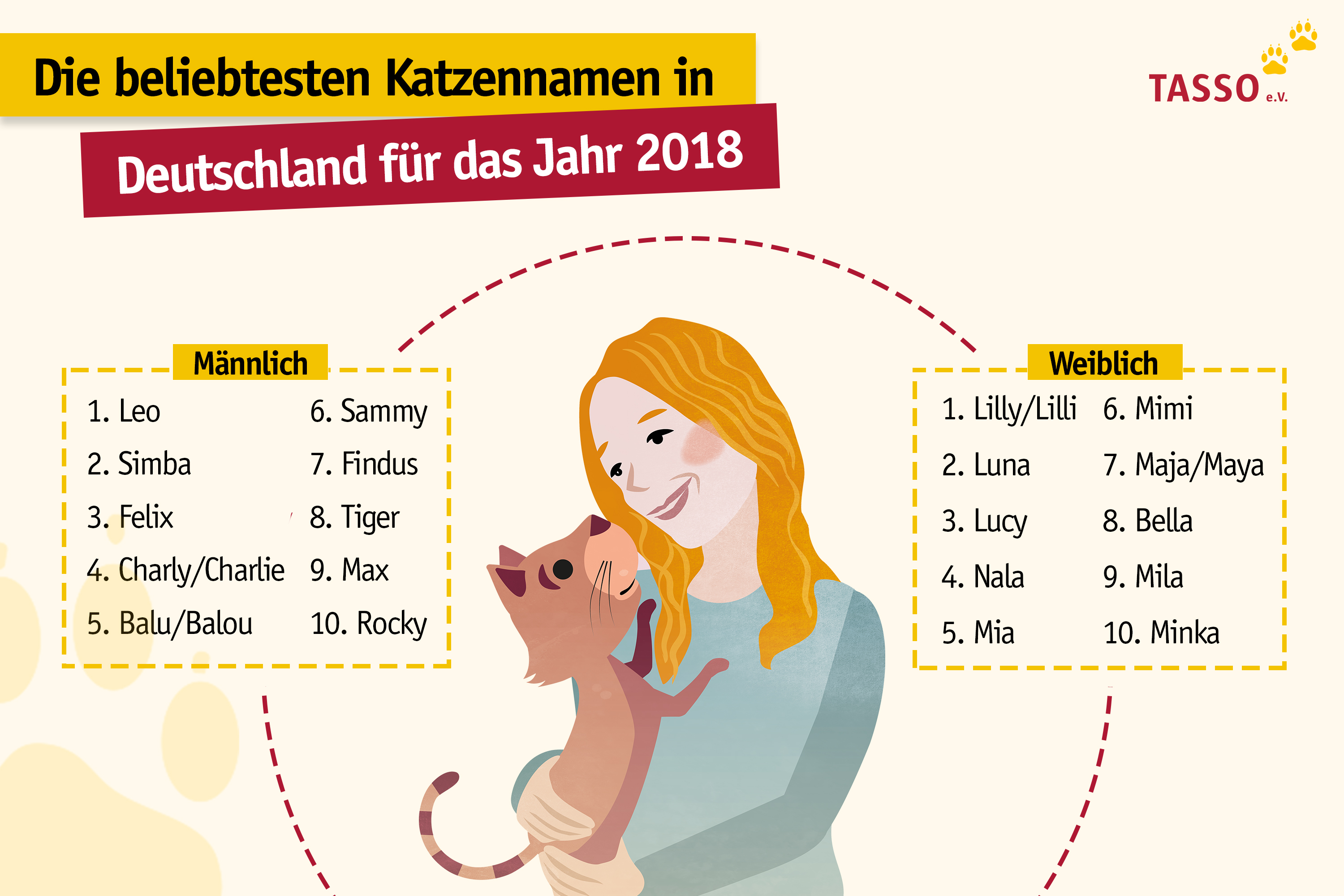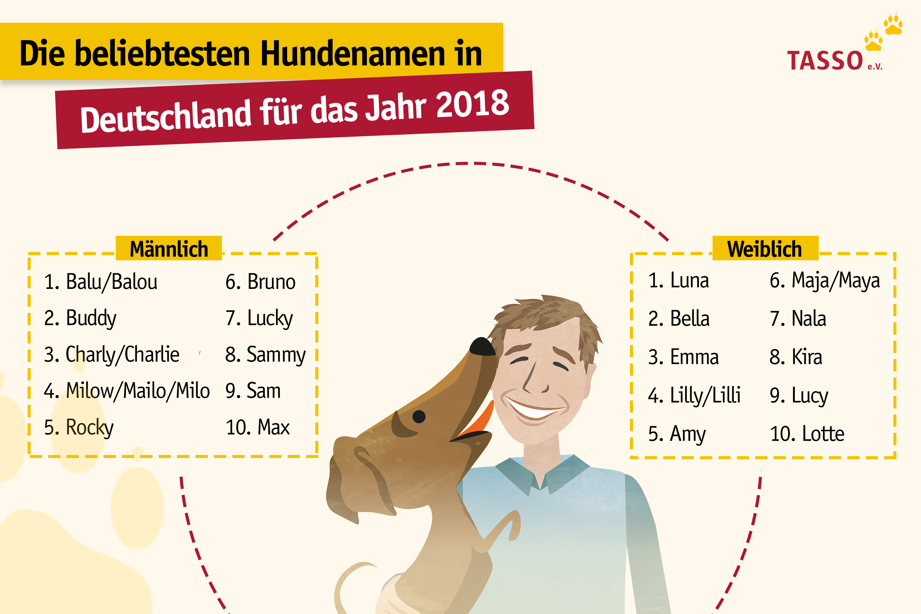 Eine Übersicht über die beliebtesten Tiernamen in den vergangenen zehn Jahren finden Sie hier: https://www.tasso.net/Service/Wissensportal/TASSO-Fakten/Die-beliebtesten-Tiernamen
