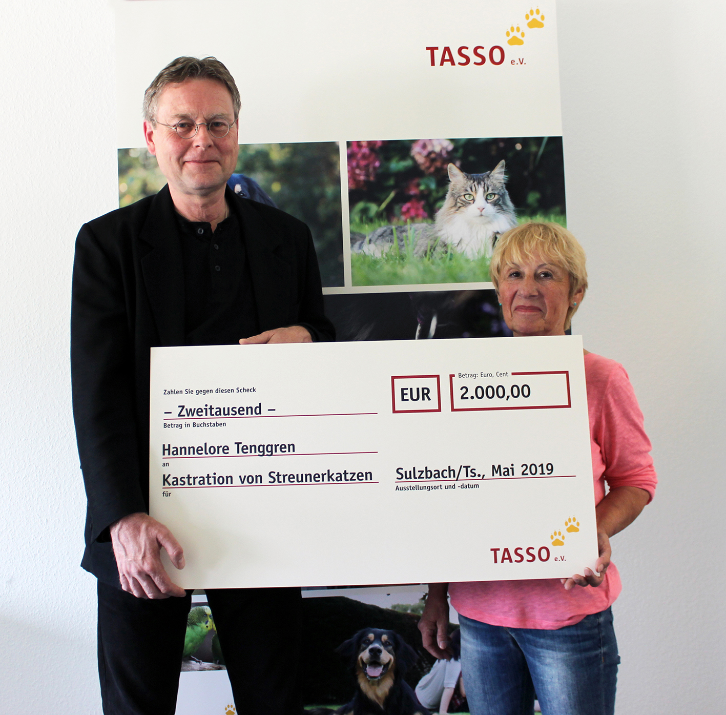 Sulzbach/Ts., 23. Mai 2019 – Über einen Scheck in Höhe von 2.000 Euro für die Kastration freilebender Katzen freut sich die Gießener Katzenschützerin Hannelore Tenggren. Mit dieser Summe unterstützt die Tierschutzorganisation TASSO e.V., die Europas größtes Haustierregister betreibt, die Arbeit der engagierten Tierfreundin, die sich seit mehr als 20 Jahren dem Tierschutz verschrieben hat und im vergangenen Jahr mit dem hessischen Tierschutzpreis ausgezeichnet wurde.