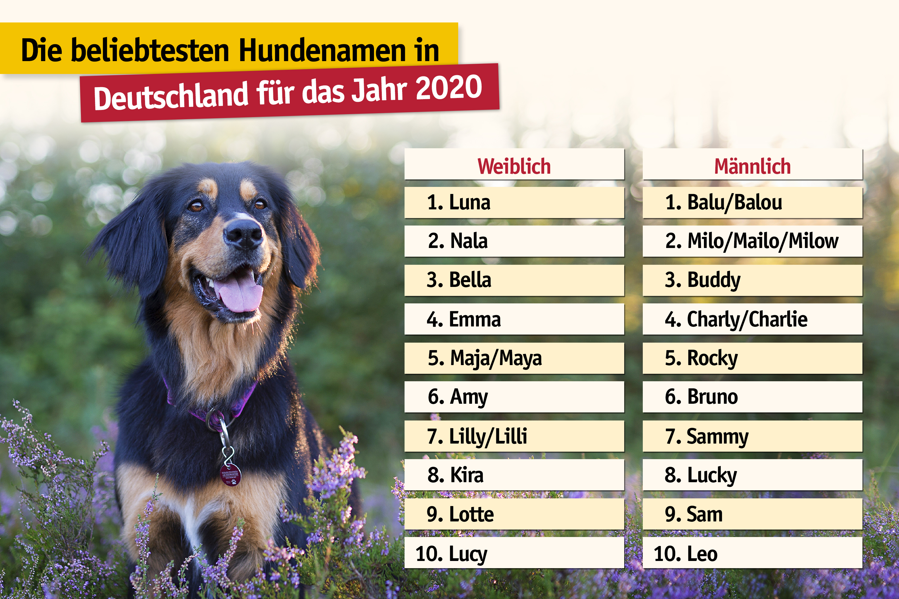 Egal ob Rassehund oder Mischling: Hündinnen werden gerne Luna, Nala, Bella, Emma, Maja, Amy oder Lilly genannt. Bei den Rüden ist Balu der Favorit. Darauf folgen Milo, Buddy, Charlie, Rocky und Bruno.