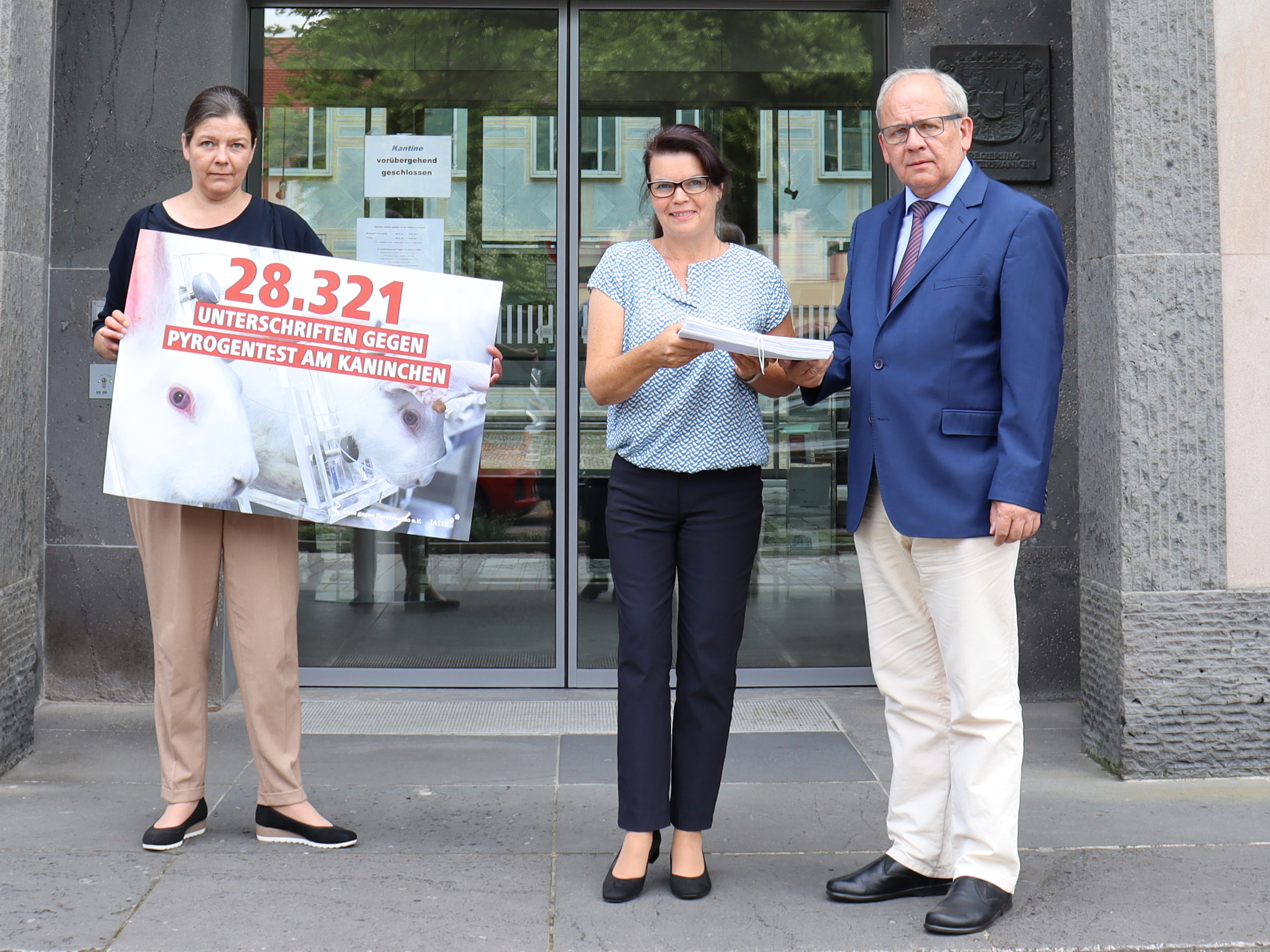 Um den Pyrogentest am Kaninchen endlich ein Ende zu setzen, hat Ärzte gegen Tierversuche gemeinsam mit TASSO die Kampagne „6.000 Kaninchen retten – Pyrogentest stoppen!“ ins Leben gerufen. Da die überwiegende Anzahl an Pyrogentests in Deutschland von dem Labor LS in Bad Bocklet durchgeführt wird, wurden die gesammelten Unterschriften heute an den Regierungspräsidenten von Unterfranken, Dr. Eugen Ehmann, übergeben.