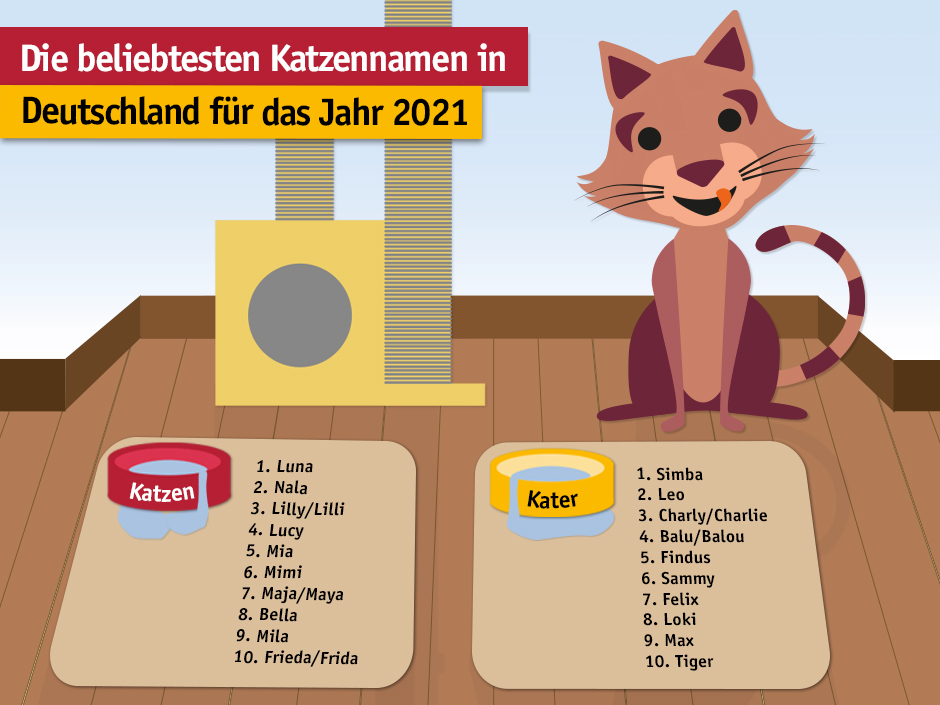 Auch bei den Katzendamen gibt es keine Überraschung auf Rang eins, hier bleibt Luna 2021 weiterhin vorne. Dafür rückt Nala auf Platz zwei und verweist Lilly auf den dritten Platz. Platz vier belegt Lucy, gefolgt von Mia, Mimi, Maja, Bella und Mila. Auf Platz 10 steigt 2021 erstmals Frieda ein und drängt damit Molly, die in den vergangenen Jahren den letzten Platz belegte, aus der Top 10-Liste. Bei den Katern setzt sich Simba wieder durch. Den zweiten bis fünften Platz belegen erneut in gleicher Reihenfolge Leo, Charly, Balu, Findus. Sammy sichert sich in diesem Jahr Platz sechs und verweist Felix auf Rang sieben. Ganz neu in der Hitliste ist Loki auf Platz acht, gefolgt von Max und Tiger.