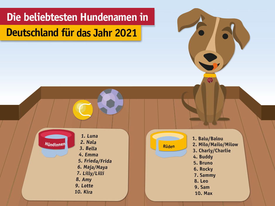 Egal ob Mischling oder Rassehund – seit mehr als einem Jahrzehnt führt Luna nun schon die Top 10-Liste der beliebtesten Namen für Hündinnen an. Platz zwei verteidigt Nala, gefolgt von Bella und Emma auf dem dritten und vierten Rang. Ganz neu in der TASSO-Hitliste ist der Name Frieda, der sich gleich den fünften Platz sichert und Maja auf Rang sechs verweist. Lilly belegt wie auch schon im vergangenen Jahr Platz sieben, gefolgt von Amy, Lotte und Kira. Bei den Rüden ist Balu der Favorit, mittlerweile das siebte Jahr in Folge. Milo belegt erneut den zweiten Platz, gefolgt von Charlie, der auf den dritten Platz vorrückt und Buddy auf Rang vier verweist. Auf den weiteren Plätzen folgen Bruno, Rocky, Sammy, Leo, Sam und Max.