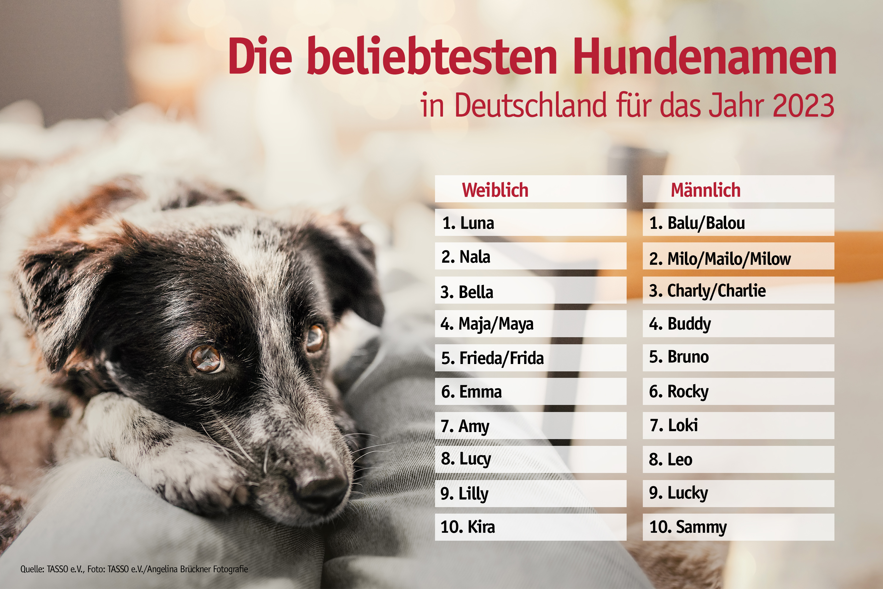 Die Zahlen basieren auf den zwischen dem 1.1.2023 und dem 31.12.2023 bei TASSO in Deutschland neu registrierten Tieren. Eine Übersicht über die beliebtesten Tiernamen der vergangenen zehn Jahre finden Sie hier.