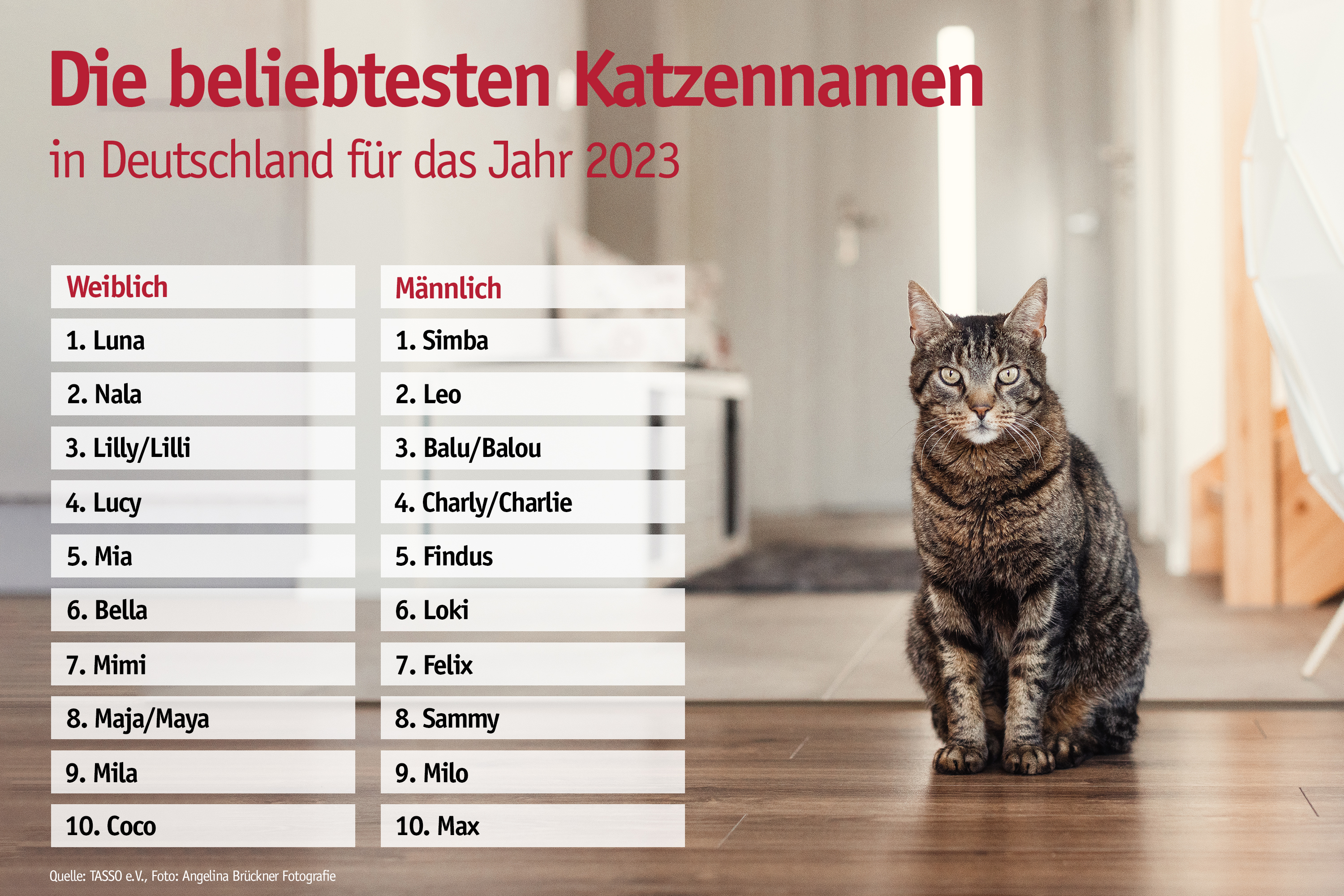 Bei den Katzendamen sichert sich Luna auch im Jahr 2023 wieder den ersten Platz. Platz zwei verteidigt Nala, gefolgt von Lilly auf dem dritten Rang. Lucy rückt auf Platz vier vor und verweist Mia auf Platz 5. Platz 6 bis 9 belegen Bella, Mimi, Maja und Mila. Ganz neu steigt erstmals der Name Coco auf Platz 10 ein und wirft Frieda aus dem Ranking.