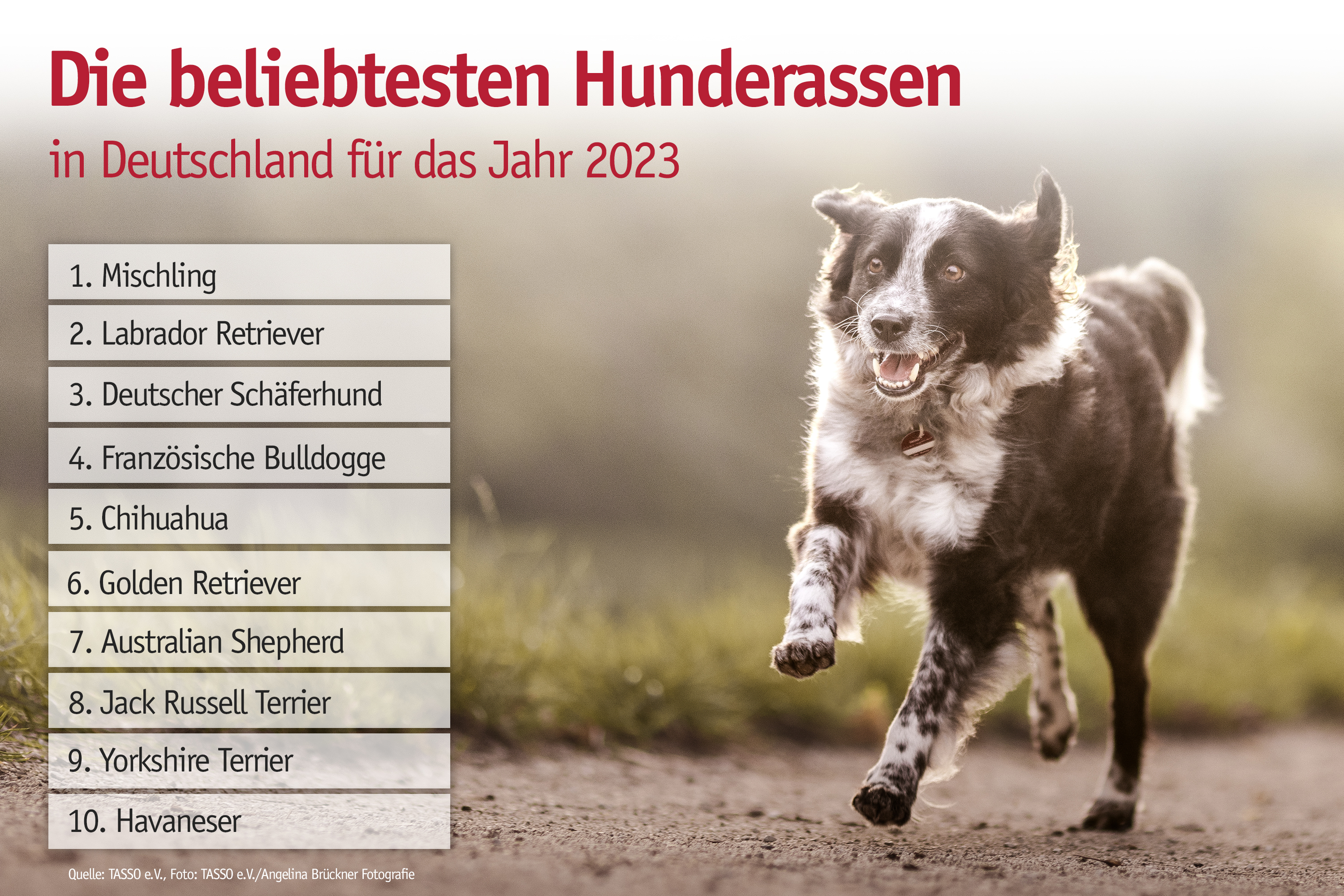 „Zwar fühlt sich das Thema der beliebten Hunderassen heiter und sorglos an, doch es hat einen ernsten Hintergrund“, sagt TASSO-Leiter Philip McCreight. „Denn unter den beliebtesten Hunderassen finden sich einige Rassen wieder, bei denen sogenannte Qualzuchtmerkmale zum Rassestandard gehören. Es ist verantwortungslos, dass immer noch Tiere gezüchtet werden, bei denen zugunsten der Rassemerkmale massive gesundheitliche Einschränkungen der Nachzuchten in Kauf genommen werden“, gibt McCreight zu bedenken. Die Folgen dieser Qualzuchten sind teilweise gravierend: Tiere, die wegen ihrer kurzen Nasen als süß gelten, können nicht mehr richtig atmen. Andere werden so klein gezüchtet, dass es zu massiven Fehlbildungen kommt. Auch Tiere, die aufgrund ihrer Schönheit beliebt sind, haben es manchmal nicht leicht. „Zum Beispiel sind Hütehunde wie der Australian Shepherd seit einigen Jahren sehr beliebt“, weiß McCreight. „Diese anspruchsvollen und ursprünglich für die Hütearbeit gezüchteten Rassen angemessen auszulasten und zu beschäftigen, kann für jemanden, der sich nicht intensiv mit den Bedürfnissen seines Tieres beschäftigt, schwierig werden.“