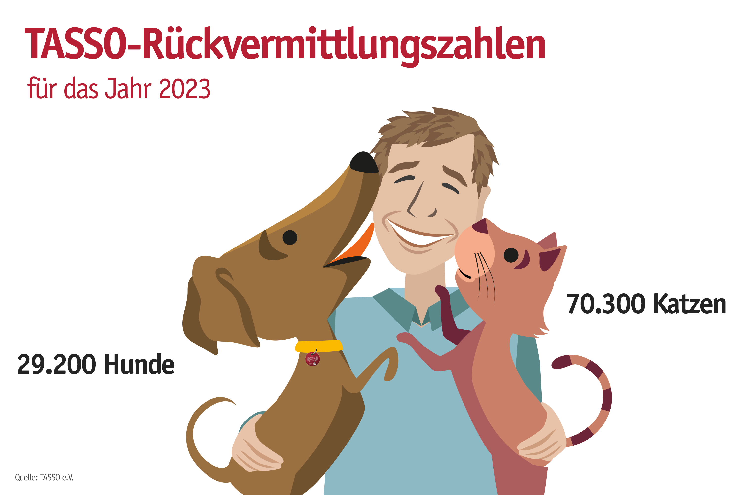 Sulzbach/Ts., 5. Januar 2024 – Knapp 124.000 Hunde und Katzen wurden im Jahr 2023 unfreiwillig von ihren Menschen getrennt. Das zeigt die aktuelle Jahresstatistik der Tierschutzorganisation TASSO e.V., die Europas größtes kostenloses Heimtierregister betreibt. Diese Zahl und auch die Zahl der erfolgreichen Rückvermittlungen unterstreicht einmal mehr, wie wichtig Kennzeichnung und Registrierung sind.