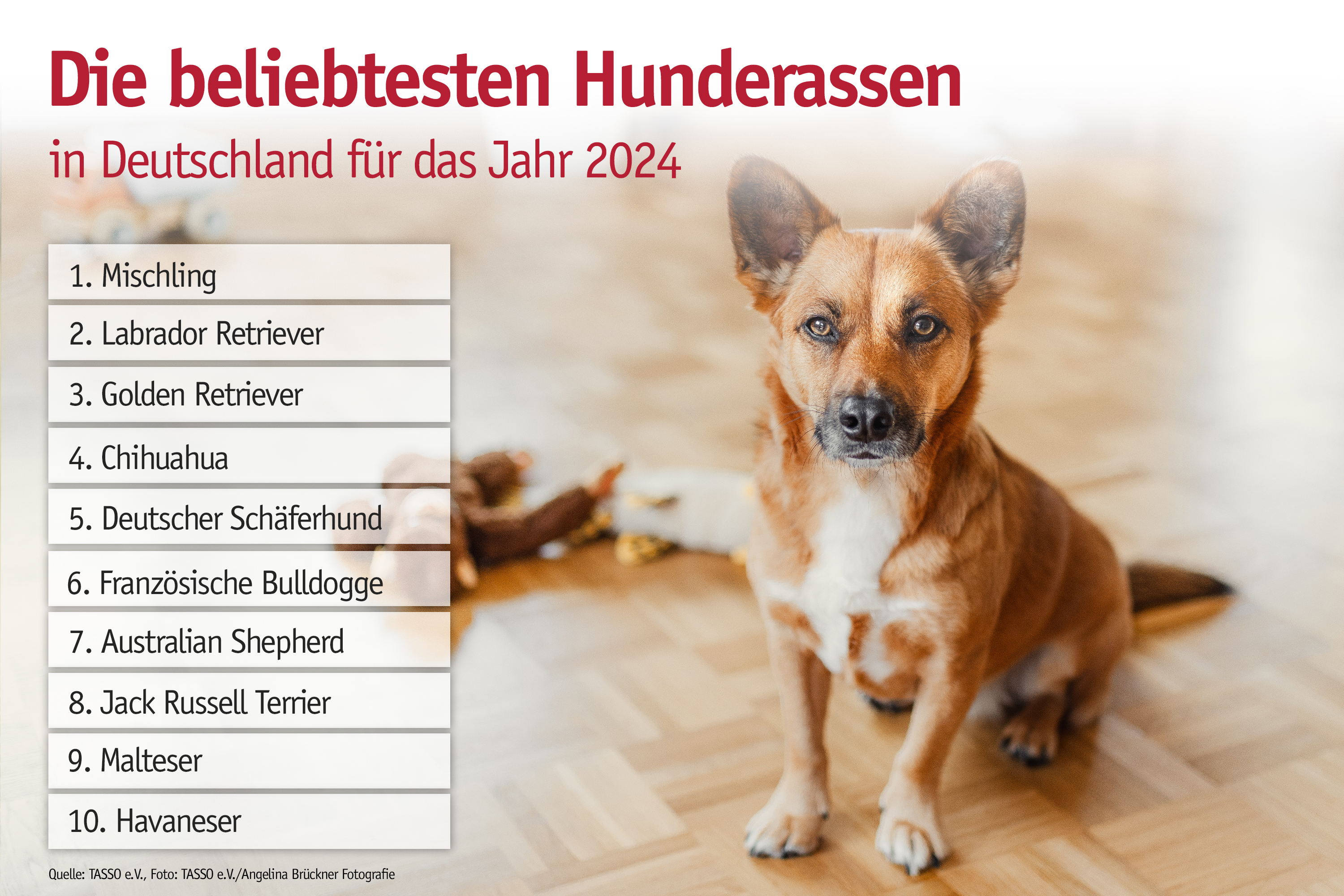 Auf Platz 2 folgt wie in den Vorjahren der Labrador Retriever, der alle anderen Rassehunde mit einem klaren Vorsprung hinter sich lässt. Mehr als 15.000 Labradore wurden im Jahr 2024 bei TASSO neu angemeldet. Im breiten Mittelfeld liegen Golden Retriever, Chihuahua, Deutscher Schäferhund und Französische Bulldogge mit Registrierungszahlen zwischen 8.800 und 8.000 Hunden nahe beieinander. Etwas alleine steht der Australian Shepherd mit knapp mehr als 6.000 neuen Registrierungen. Am unteren Ende der Rangliste liegen wieder sehr nahe bei einander Jack Russell-Terrier (knapp 4.000 Neuregistrierungen), Malteser (knapp über 3.500) und Havaneser (knapp unter 3.500).