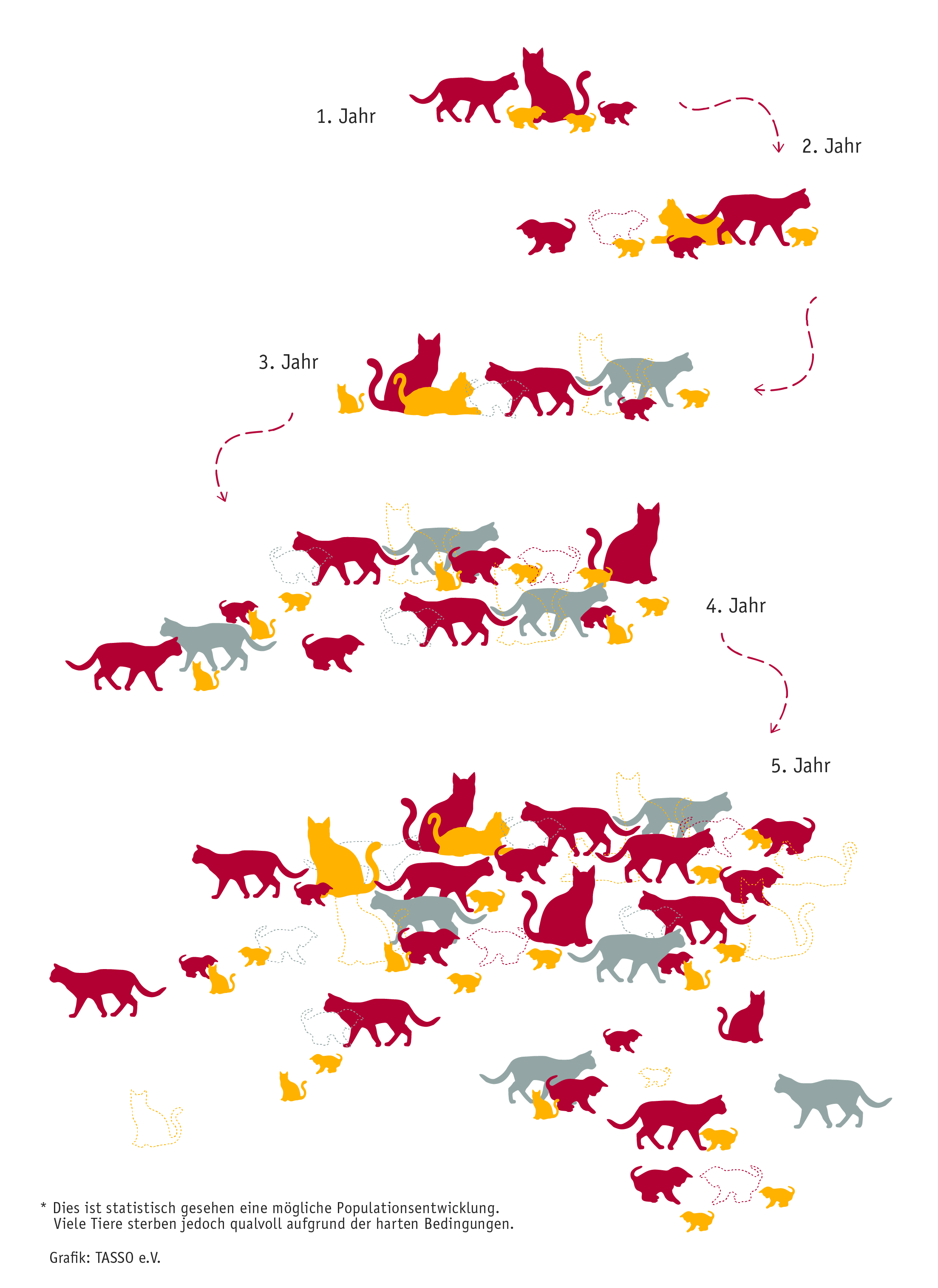 Schätzungen zufolge leben in Deutschland zwei Millionen Streunerkatzen, die ursprünglich alle von entlaufenen, ausgesetzten oder zurückgelassenen Hauskatzen abstammen. Die in der Regel unkastriert zusammenlebenden Tiere vermehren sich explosionsartig. Ihr Elend verschlimmert sich dadurch zusehends. Eine Kätzin wird zweimal jährlich rollig und kann jeweils drei bis sechs Kitten zur Welt bringen. Die meisten von ihnen sind Menschen gegenüber scheu und leben im Verborgenen im täglichen Überlebenskampf um Nahrung und gegen Krankheiten, Parasitenbefall und die Witterung. Wenn sie sich dann noch mit freilaufenden Besitzerkatzen paaren, wird das Leid noch größer. Mit einem dringenden Appell wendet sich Heike Weber, Geschäftsleiterin Tierschutz bei TASSO, daher an Halterinnen und Halter von Katzen mit Freigang: „Wie kann man 100 Katzen retten? Indem man eine kastrieren lässt. Übernehmen Sie Verantwortung und lassen Sie Ihre Freigängerkatze kastrieren, um das Elend nicht weiter zu verschärfen.“