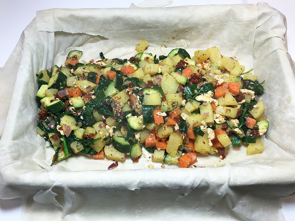 Jetzt die getrockneten Tomaten (und den Hirtenkäse) in die Füllung untermischen und alles kastenformartig auf dem Teig verteilen. Nun die einzelnen Teigschichten abwechselnd auf die Füllung legen.