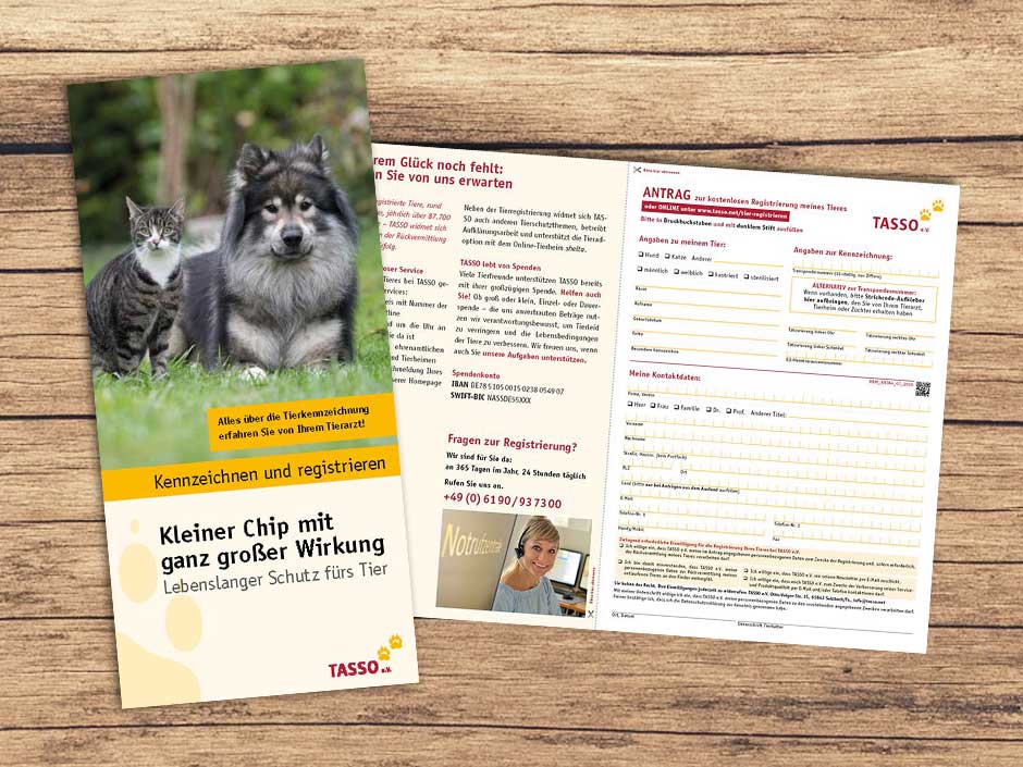 © TASSO e.V. Mit den kostenlosen Materialien können Sie Tierhaltern zeigen, wie wichtig die Kennzeichnung und Registrierung ist. Kostenlose Bestellung von Materialien Die Kennzeichnung und Registrierung spielt für die Rückvermittlung von entlaufenen Tieren unbestritten eine große Rolle. Um die Wichtigkeit dieses Thema auch neuen Tierhaltern zu erläutern, bieten wir Ihnen eine Vielzahl an kostenlosen Informationsmaterialien an. Mit dem Flyer „TASSO-Prinzip“ können Sie den Tierhalter:innen zeigen, wie das TASSO-Prinzip genau funktioniert und wie sie ihre Tiere vor dem endgültigen Verschwinden schützen können. Zusätzlich zu den Informationsmaterialien können Sie auf unserer Seite für Bestellungen ebenfalls Registrierungsanträge anfordern oder per Download kostenlos herunterladen. Bestellung von TASSO-Informationsmaterialien